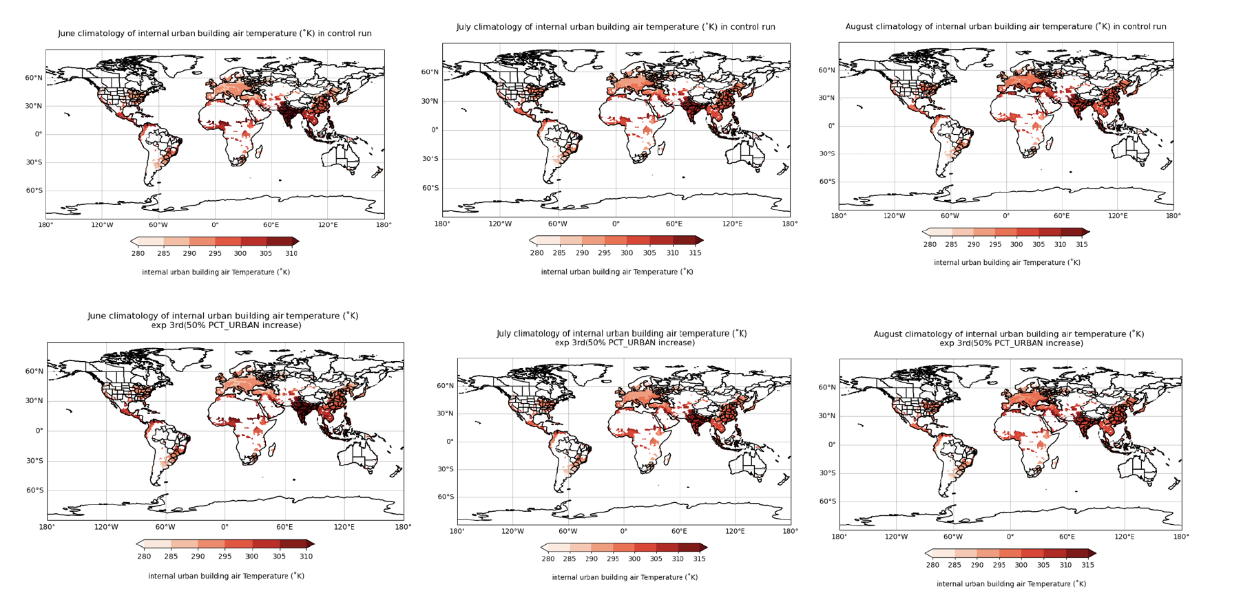 An increase in internal urban building air temperature (K) in response to changes in urban land cover can consistently be observed across the same Asian regions for all-month climatology, although the feedback is relatively small, approximately +0.13 K (Figure 5). This indicates that indoor air temperature (T_BUILD) is still affected by an increase in urban land area within the grid cell of the CESM urban representation, even if the effect is minor. T_BUILD increases for all summer seasons, reaching +0.17 K above the control run for June climatology (Figure 5).
