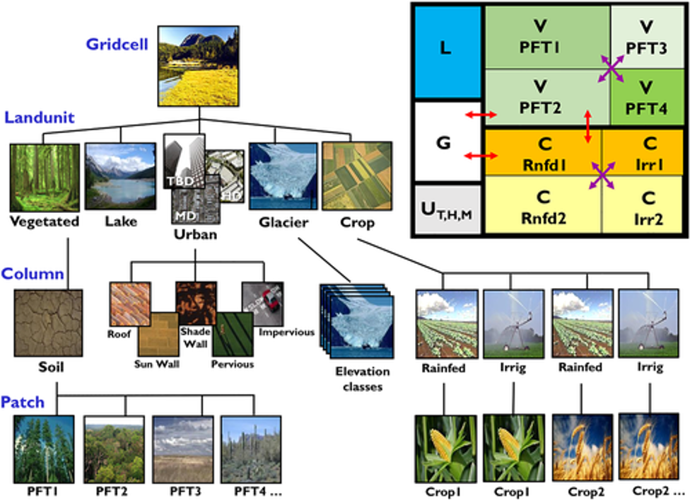The Community Land Model (CLM5) is the version 5 default land component of CESM2(http://www.cesm.ucar.edu/models/cesm2/ ) that represents land surface spatial heterogeneity in subgrid level (Lawrence et al., 2019). In this approach, each grid cell of land surface consists of various units, column and patches based on surface features. The land units represented are natural vegetation, lake, glacier, urban areas, crop land, wetlands, other water bodies (as shown in figure 1). This means per grid cells is composed of fraction/percentage of land surface with each property that exist in that location. The urban Representation based on urban land parameterization Community Land Model Urban (CLMU) (Oleson and Feddema, 2019) that simulates urban climate at urban scale. Urban areas are further classified by this parameterization into three classes that are tall building urban areas (TBD), high density (HD) urban areas and medium density urban areas (MD). CLMU classifies these urban unit further into different urban surfaces: building walls, impervious surface, roofs, urban vegetated surface, streets etc. which are in scale of an urban canyon (Oke et al., 2017, Lawrence et al., 2019).
